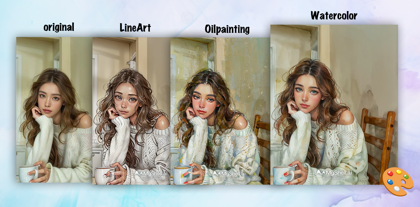 Watercolor: Embrace the soft and sophisticated touch of Watercolor. This style uses light colors and delicate strokes to give your images a refined, artistic feel, perfect for those who appreciate the beauty of intricate paintings.