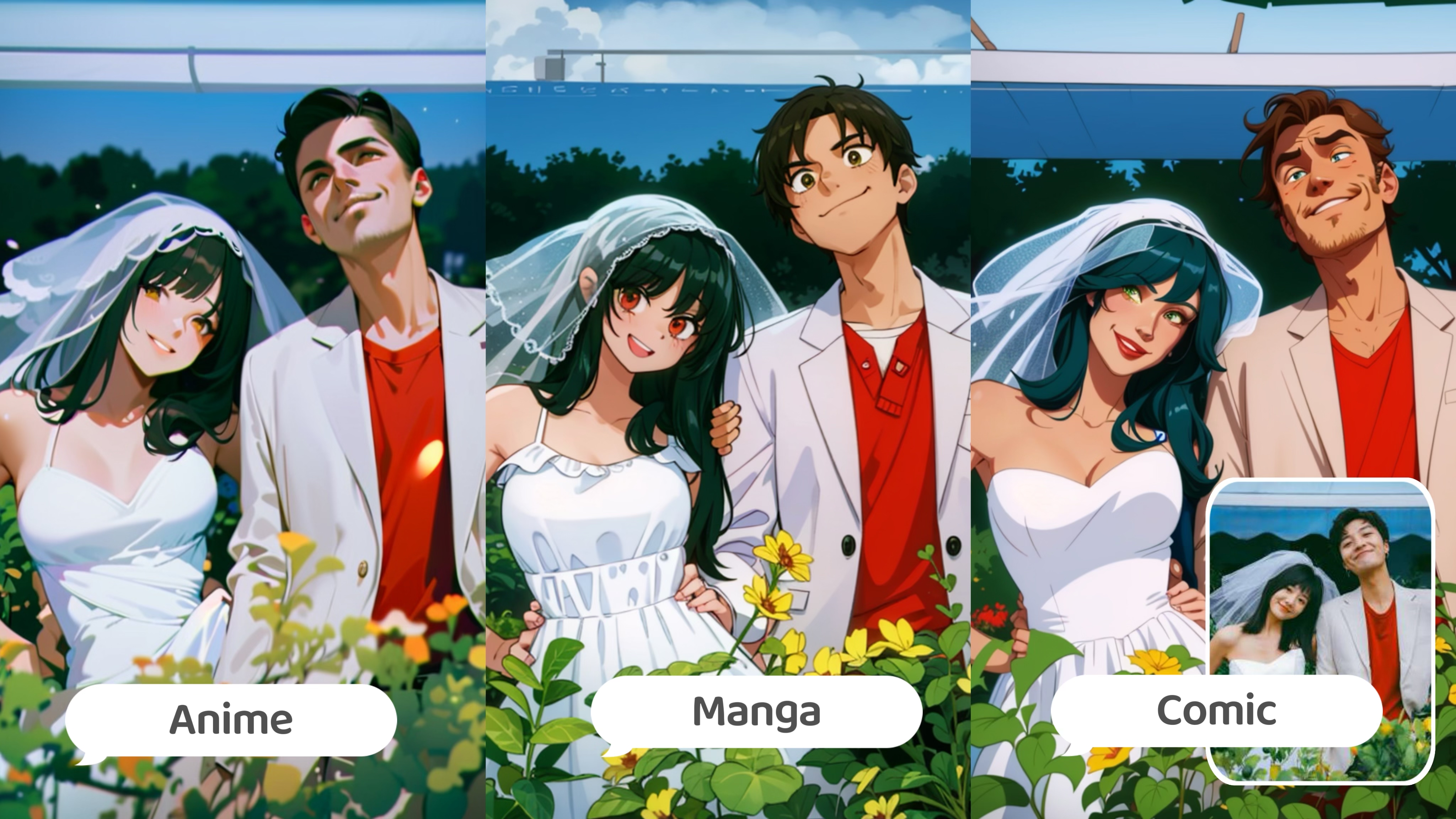 Anime Style: Transform your photos into beautiful anime adaptations! This option applies soft lines, tones, and simplified details to enhance the beauty of your characters, giving them the classic anime look that fans adore.