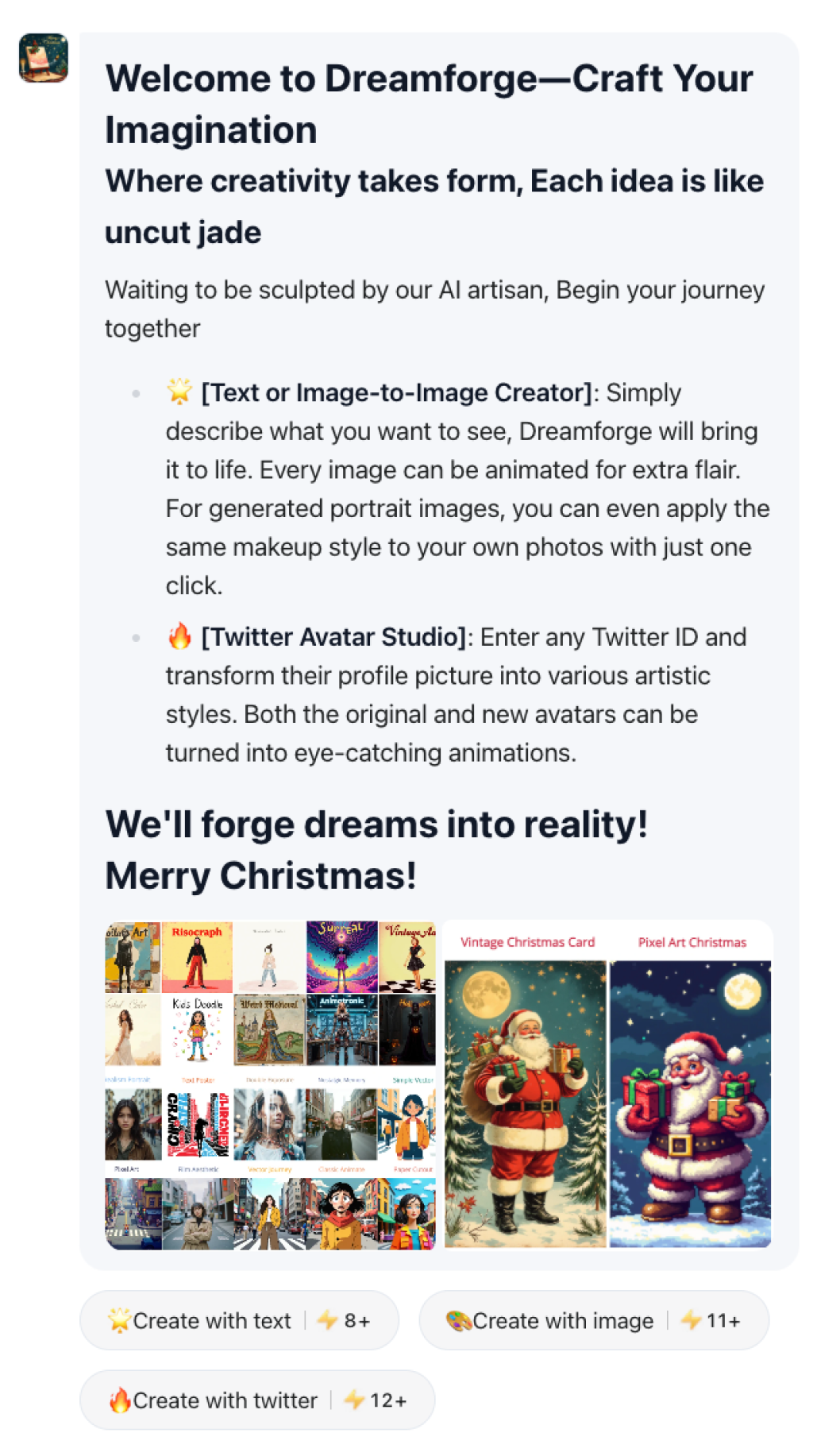 Where creativity takes form, Dreamforge is the AI artisan that transforms your ideas from uncut jade into masterpieces. Begin your journey together and let your creativity flow.