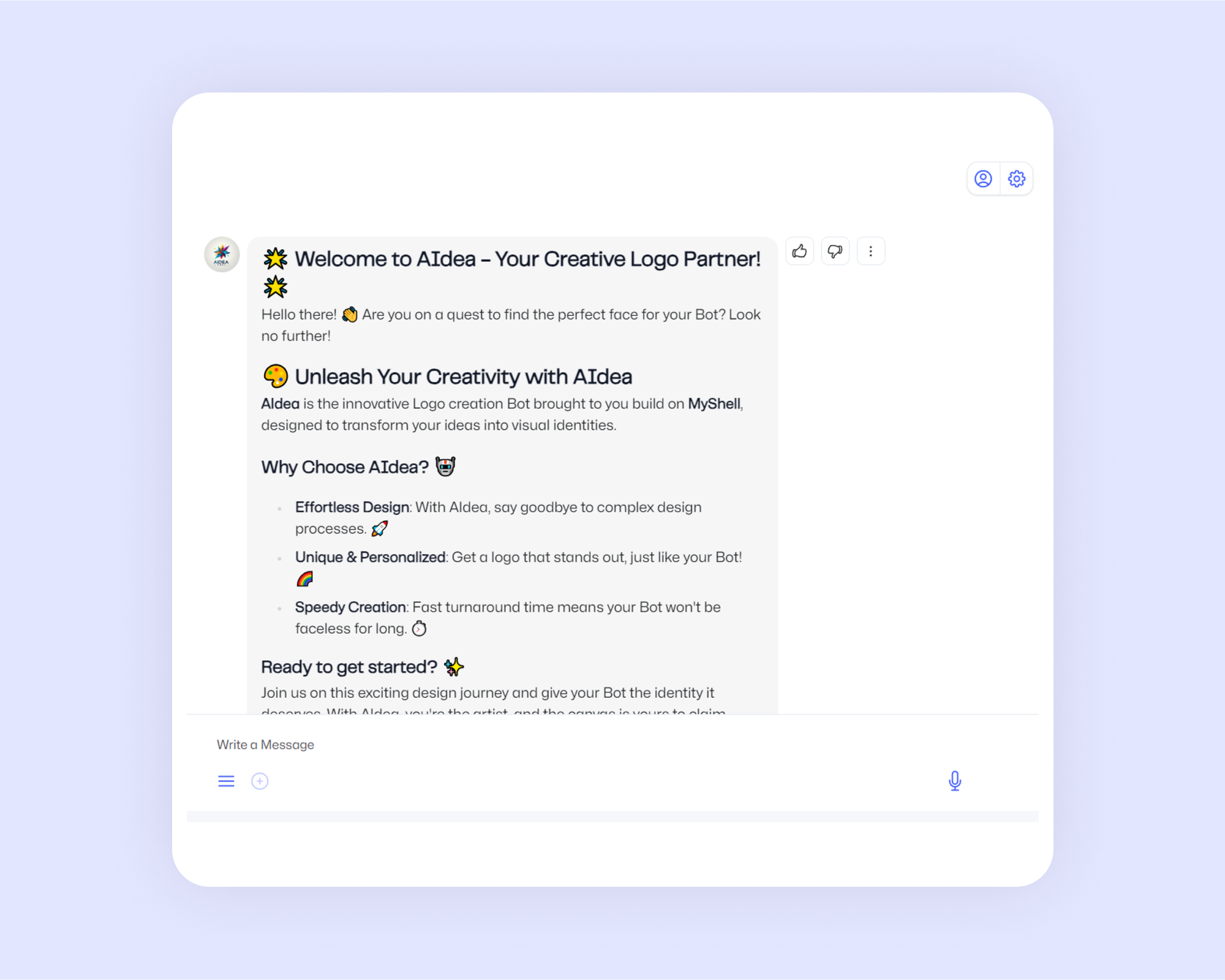 If you were ever in need of direction on creating a logo for you bots, search no more and allow AIdea, to help you in the creative procedure using your own descriptions to tailor a logo perfect for you!