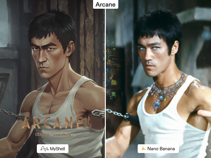 Stylization in the Arcane universe demands mood, grit, and cinematic shading. Nano Banana falters here, generating flat, game-like visuals that miss the show’s drama. MyShell, however, nails the look: dark palettes, sharp contrasts, and story-driven intensity. It doesn’t just mimic the filter—it channels the atmosphere.