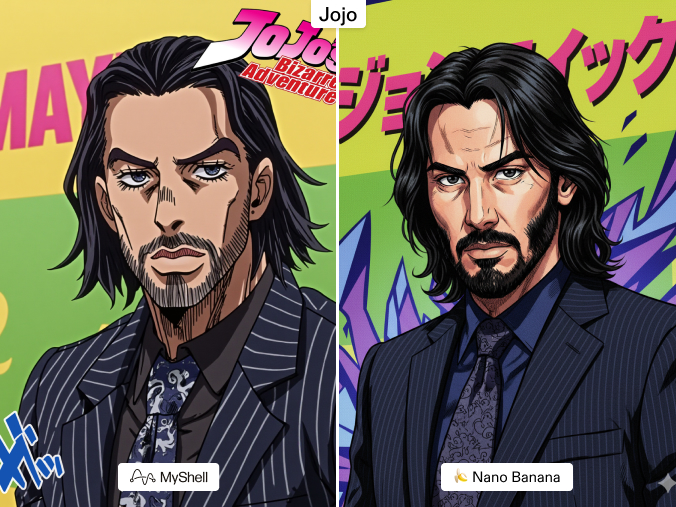 JoJo’s style is eccentric, exaggerated, and full of personality. Nano Banana reduces it to basic line art, stripping away flamboyance. MyShell captures the essence: bold outlines, exaggerated proportions, and a sense of flamboyant movement. For JoJo-inspired art, the difference is night and day.