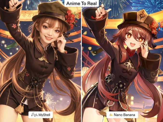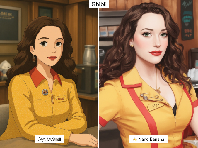 The Ghibli aesthetic is subtle—warm tones, soft edges, dreamlike backgrounds. Nano Banana’s outputs look generic, often too sharp or sterile. MyShell manages to reproduce the gentleness and natural charm of Ghibli worlds, maintaining harmony between character and environment. The result feels like a frame from an actual animated film.