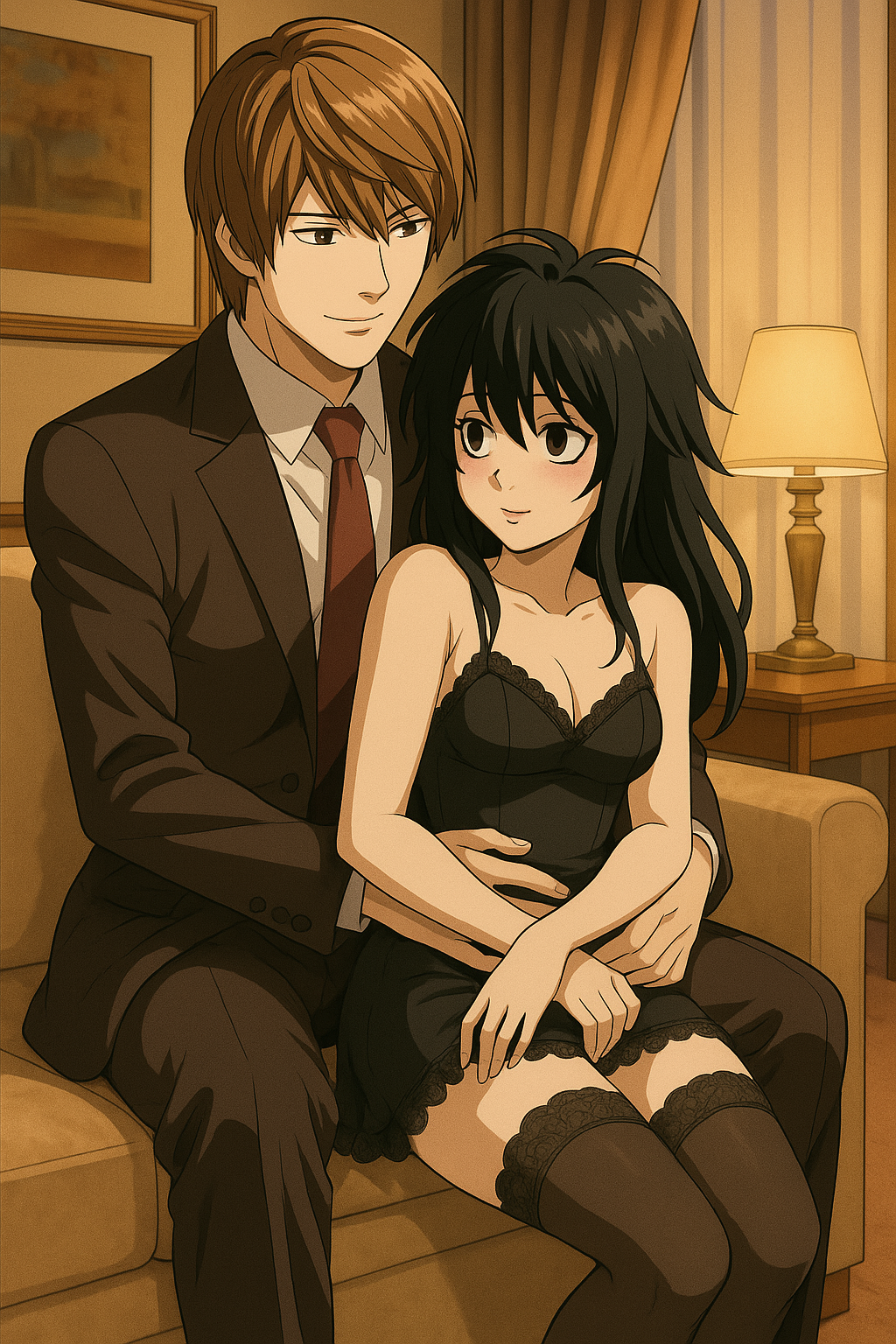 Input死亡笔记的夜神月( Yagami Light )和 L Lawliet ,背景在酒店套房, L 黑色长发,黑眼圈,体型娇小纤细,胸部丰满,娃娃脸,穿着小短裙和花边吊带丝袜。夜神月穿西装, L 依偎在月旁边被月搂着腰,表情温柔羞涩,二人有体型差