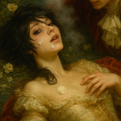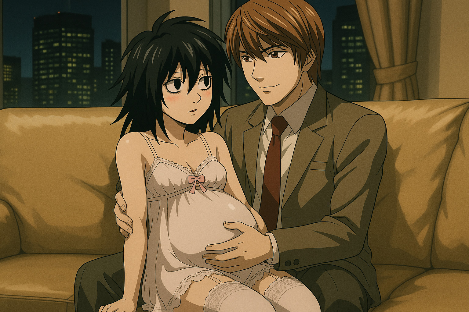 Input死亡笔记的夜神月( Yagami Light )和 L Lawliet ,背景在高级公寓沙发, L 黑色长发,黑眼圈,体型娇小纤细,娃娃脸,穿着薄纱吊带裙和花边丝袜。 L 的肚子鼓了起来。夜神月穿西装, L 依偎在月旁边被月搂着腰,表情温柔羞涩,二人有体型差